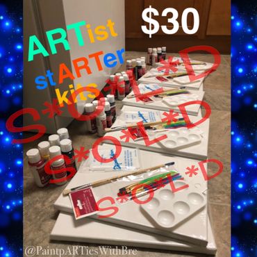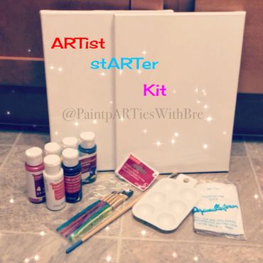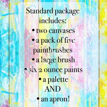 Standard $30 package includes: two canvases (9x12), a pack of five paintbrushes, six 2oz paints, a palette and an apron! Additional canvases can be included in a personalized stARTer kit!